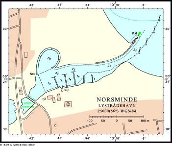 Hold respektfuld afstand til Hesbjerg Grund, Kysing Næs og Kysing Hage. Når molefyret (fast grønt lys) pejles i kurs 230 grader, kan der uden problemer styres direkte mod havnen.